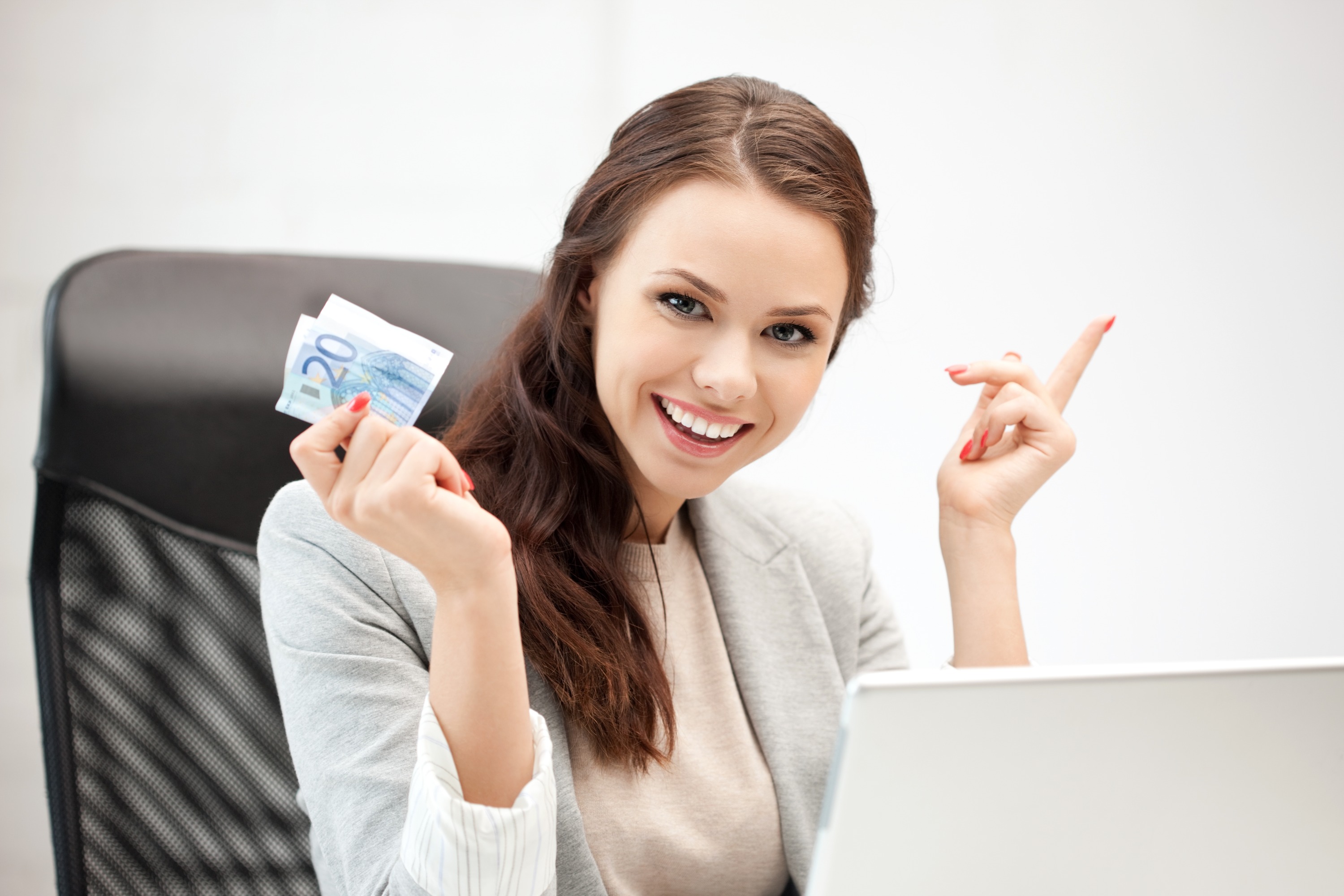 Девушка с ноутбуком и купюрой евро в руке.