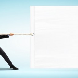Симпатичная пара стоит рядом возле большого белого баннера.